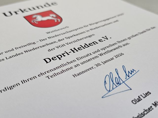Die Depri-Helden haben sich im letzten Jahr für den Wettbewerb "unbezahlbar und freiwillig - Der Niedersachsenpreis für Bürgerengagement" beworben. Auch wenn wir nicht zu den Preisträgern gehörten, wurde uns doch eine kleine Überraschung zugeschickt. Uns erreichte eine Urkunde der Niedersächsischen Staatskanzlei: "Wir würdigen Ihren ehrenamtlichen Einsatz und sprechen Ihnen großen Dank aus." Unterschrieben ist die Urkunde unter anderem von Niedersachsens Ministerpräsident Olaf Lies. Es macht uns ein klein bisschen stolz.